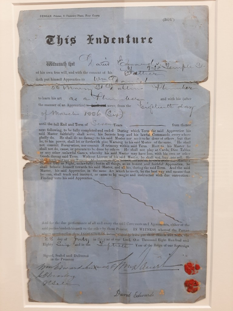The indenture for the plumbers apprenticeship, meanwhile, has an address for David Edwards in Temple Street. At a family funeral many years ago, Bernard Edwards discovered he had distant relations that he didn’t know about, still living in what he describes as ‘George’s Pocket’ off Temple Street.