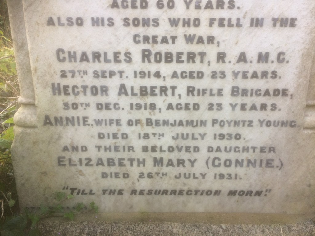 Below is the tombstone of Robert Anderson Mackenzie, who survived the sinking of the Lusitania by the Germans in 1915 only to be killed in his shop during the Easter Rising.